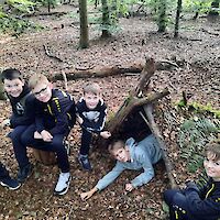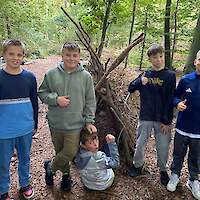 Für 107 Schü­le­rin­nen und Schü­ler star­te­te eine span­nen­de Woche zunächst mit einer drei­tä­ti­gen Klas­sen­fahrt zum Wolfs­berg nach Kle­ve. Bei bes­tem Wet­ter soll­ten unter Anlei­tung von Natur­gui­de Wal­de­mar und sei­nem Team im Wald Schutz­hüt­ten ent­ste­hen, in Grup­pen wur­de gemein­sam geplant, gesam­melt und erfolg­reich gebaut. Auch beim Feu­er­ma­chen mit Feu­er­stein und Rei­sig wur­de Zusam­men­ar­beit und Geduld am Ende bei allen belohnt, der Jubel war groß, als die ers­ten Flam­men zu sehen waren.