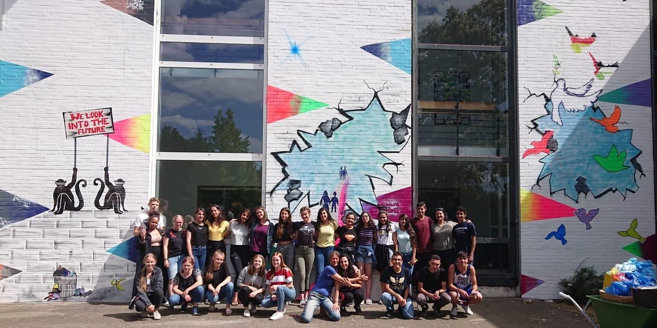 Unter dem Leitspruch „Kreativ gegen Mauern – Banksy bewegt“, ließen sich die 16- und 17-jährigen palästinensischen und deutschen Schüler vom britischen Street-Art Künstler Banksy inspirieren. Die Woche begann mit einem Austausch über das bereits vorhandene Wissen über Banksy und seine Kunst. Gemeinsam sprachen die insgesamt 24 Schüler über einige Graffitis, die die Palästinenser im Original aus ihrer Heimatstadt gut kannten. Am nächsten Tag konnte man sich in der Banksy Ausstellung MOCO weitere Eindrücke verschaffen. Dieser Besuch in Amsterdam war für Palästinenser und Deutsche gleichermaßen spannend. Denn dort wurden einige kulturelle Unterschiede nochmal deutlicher als am Tag zuvor. Vieles war für die palästinensische Gruppe neu. So erwartete beispielsweise keiner der deutschen Schüler, dass zwei Palästinenser erst einmal nicht am Treffpunkt pünktlich auftauchten; so groß war ihre Freude über die Möglichkeit sich ohne Mauern in einer Stadt frei bewegen zu können.
