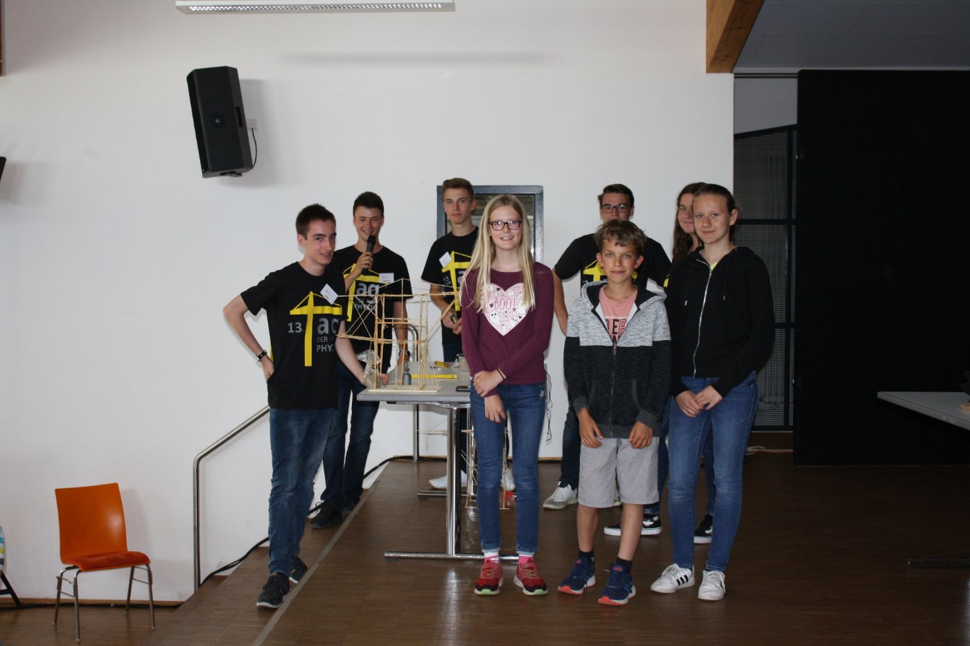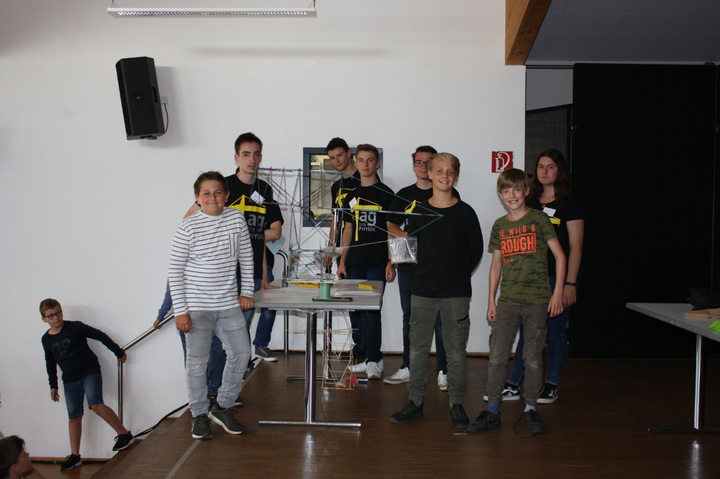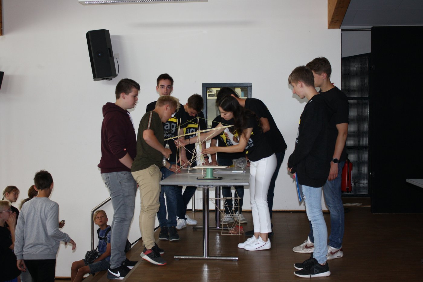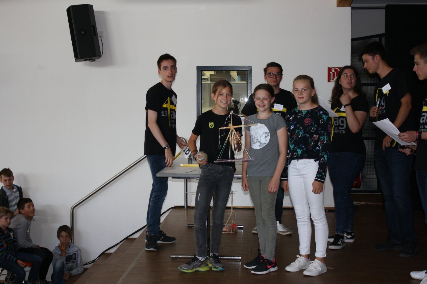 Der Wettbewerb war ein voller Erfolg. 114 Schülerinnen und Schüler in über 50 Teams stellten sich der Herausforderung einen Lastkran aus Schaschlikspießen, Kleber und Faden zu bauen, der eine Mindesthöhe von 40 cm haben musste und an dessen Ausleger in einem Abstand von 25 cm ein Gewicht von 500 g angehängt wurde. Der Kran durfte ein Gegengewicht z. B. in Form eines Sandsackes besitzen und musste der Last 30 Sekunden standhalten. Ziel war es, den leichtesten Kran mit dem geringsten Gegengewicht zu bauen. Die Schülerinnen und Schüler bewiesen viel Ausdauer und Kreativität, sowohl beim Entwurf der Kräne, als auch bei der künstlerischen Gestaltung.