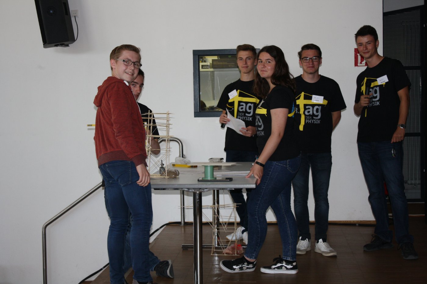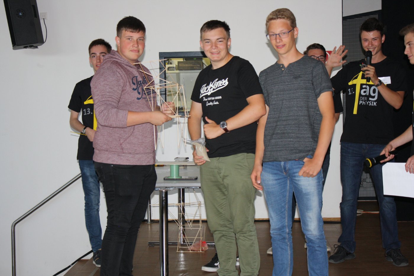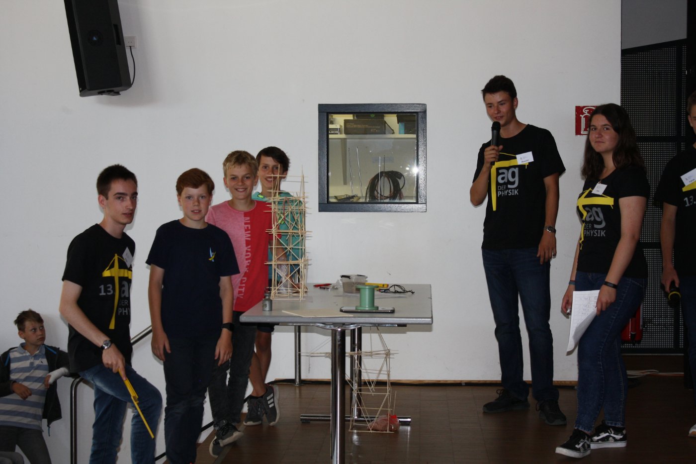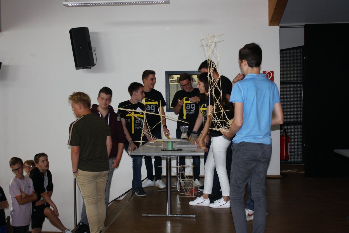 Der Wettbewerb war ein voller Erfolg. 114 Schülerinnen und Schüler in über 50 Teams stellten sich der Herausforderung einen Lastkran aus Schaschlikspießen, Kleber und Faden zu bauen, der eine Mindesthöhe von 40 cm haben musste und an dessen Ausleger in einem Abstand von 25 cm ein Gewicht von 500 g angehängt wurde. Der Kran durfte ein Gegengewicht z. B. in Form eines Sandsackes besitzen und musste der Last 30 Sekunden standhalten. Ziel war es, den leichtesten Kran mit dem geringsten Gegengewicht zu bauen. Die Schülerinnen und Schüler bewiesen viel Ausdauer und Kreativität, sowohl beim Entwurf der Kräne, als auch bei der künstlerischen Gestaltung.