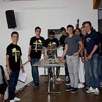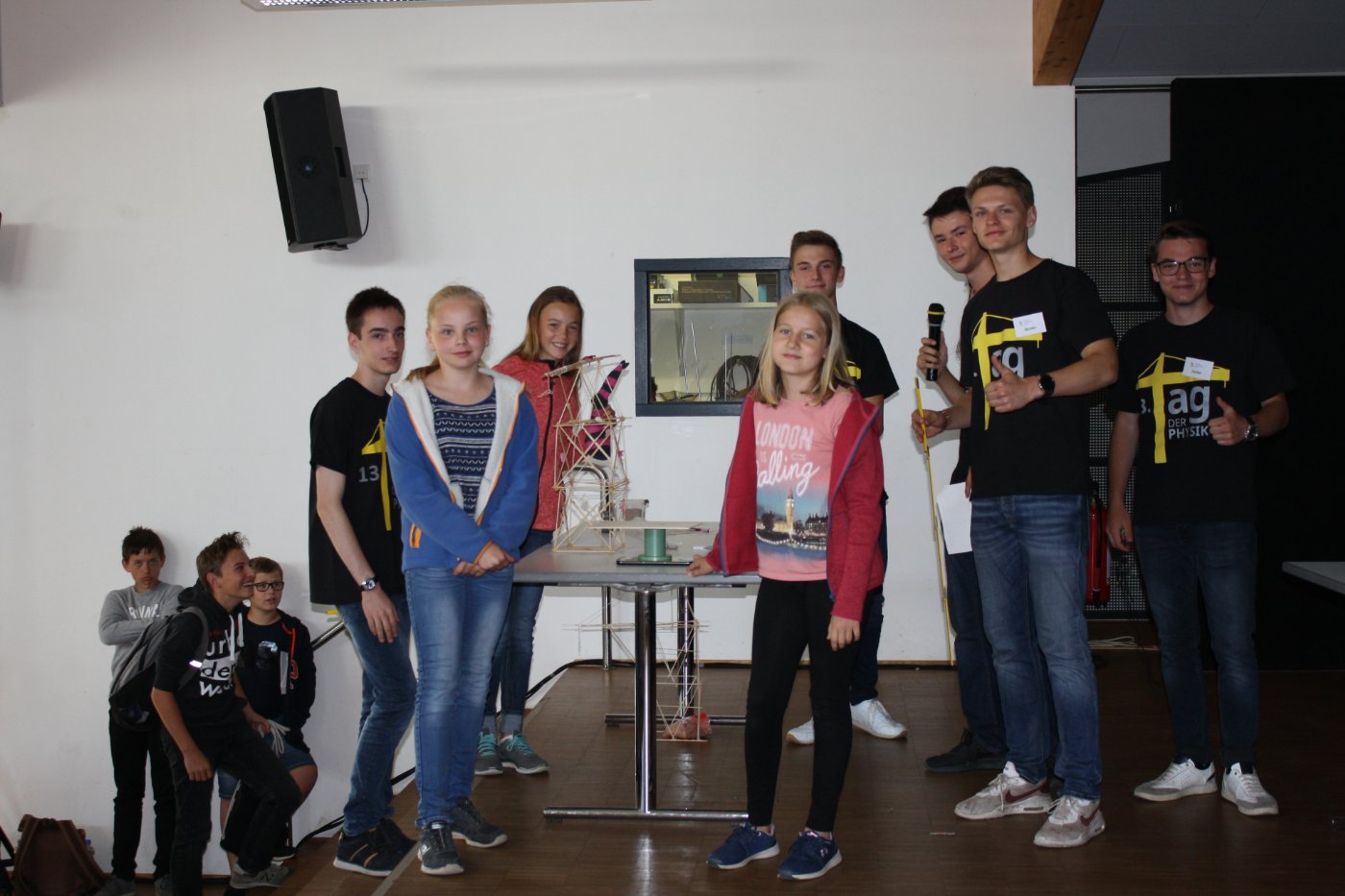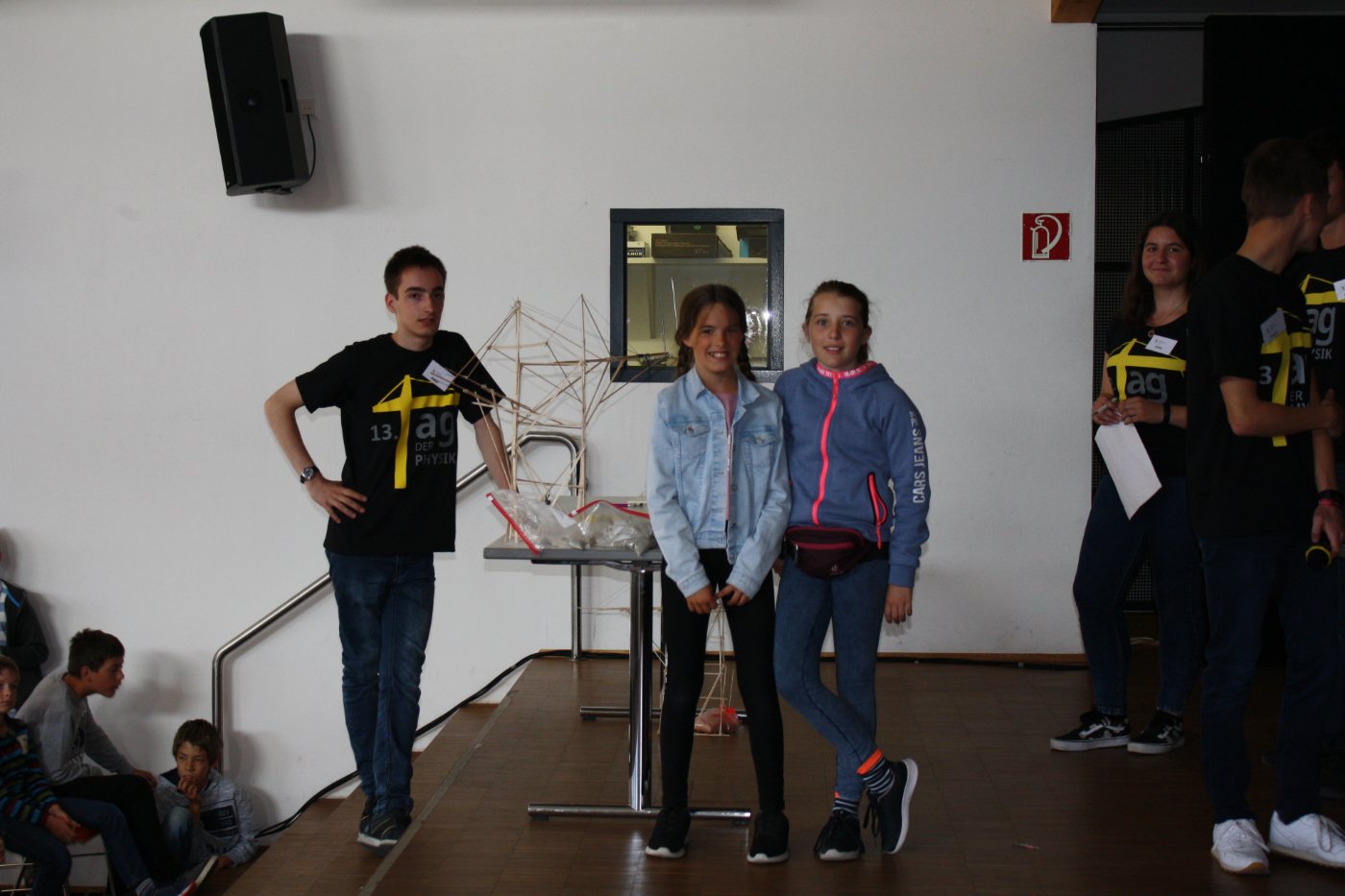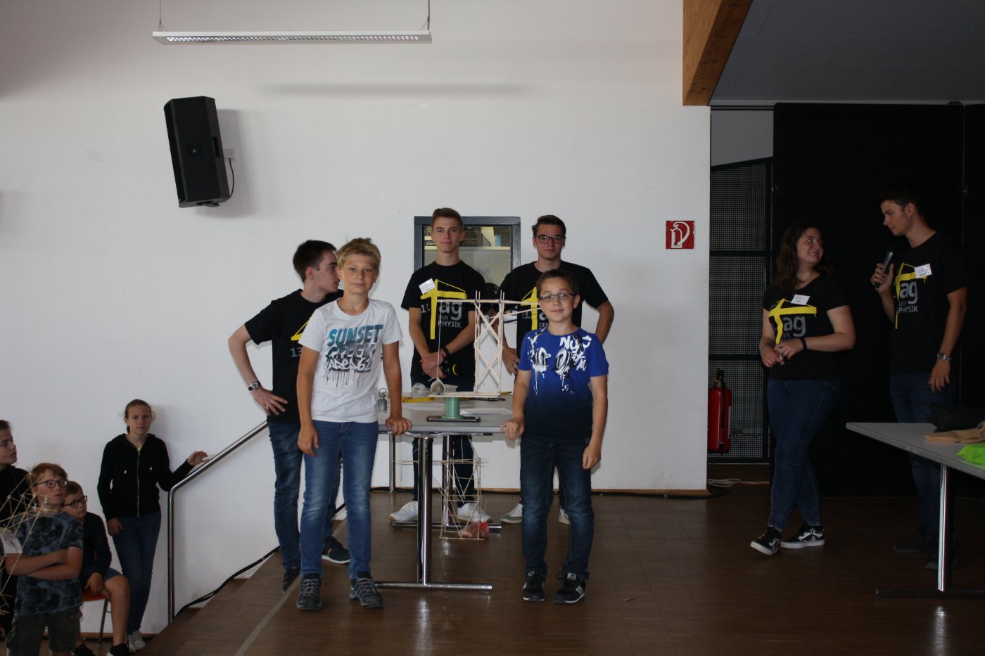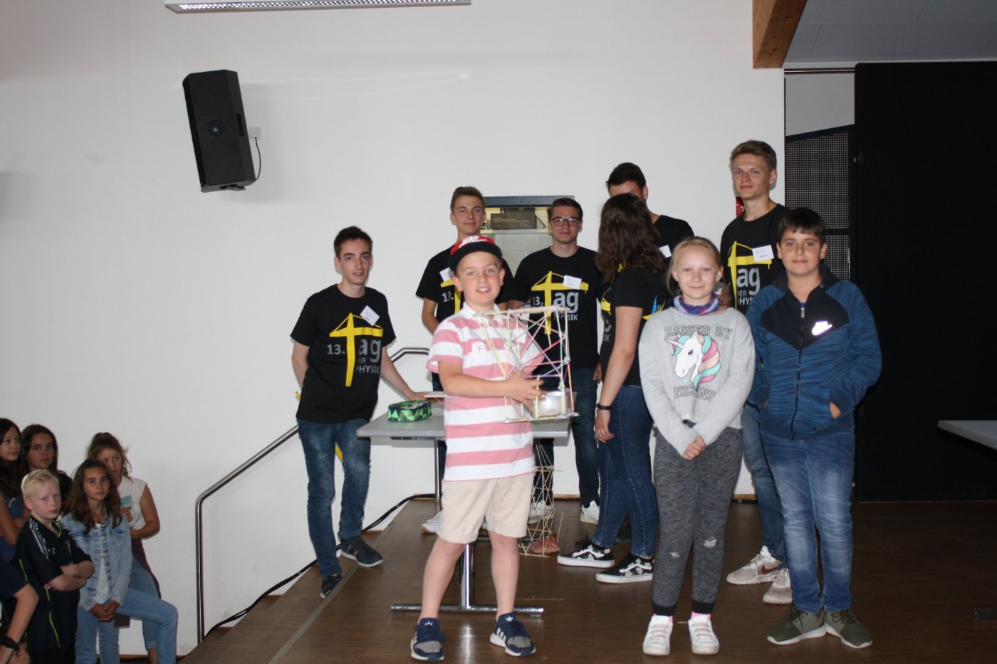 Der Wettbewerb war ein voller Erfolg. 114 Schülerinnen und Schüler in über 50 Teams stellten sich der Herausforderung einen Lastkran aus Schaschlikspießen, Kleber und Faden zu bauen, der eine Mindesthöhe von 40 cm haben musste und an dessen Ausleger in einem Abstand von 25 cm ein Gewicht von 500 g angehängt wurde. Der Kran durfte ein Gegengewicht z. B. in Form eines Sandsackes besitzen und musste der Last 30 Sekunden standhalten. Ziel war es, den leichtesten Kran mit dem geringsten Gegengewicht zu bauen. Die Schülerinnen und Schüler bewiesen viel Ausdauer und Kreativität, sowohl beim Entwurf der Kräne, als auch bei der künstlerischen Gestaltung.