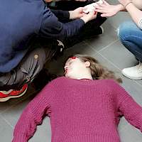 Das Schminken einer Platzwunde (siehe Foto) und die Darstellung vieler anderer Verletzungen lernten unsere Schulsanis bei dem Notfalldarstellungslehrgang im Januar.