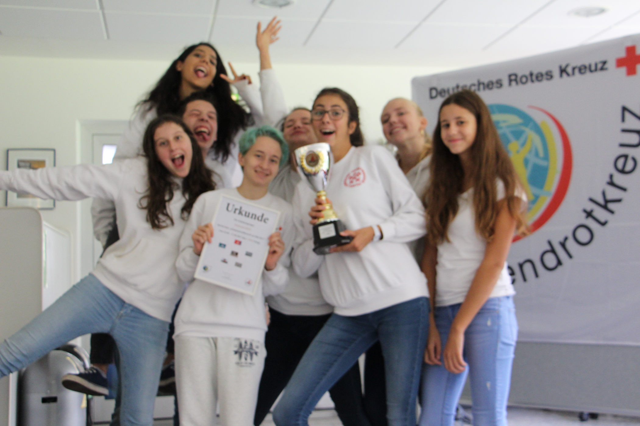 Durch ihre gute Vorbereitung und tolle Teamarbeit konnten sich unsere Schulsanis gegen zahlreiche Mitstreiter aus dem Landesverband Nordrhein durchsetzen und suchen nun nach einem würdigen Platz für ihren Pokal.