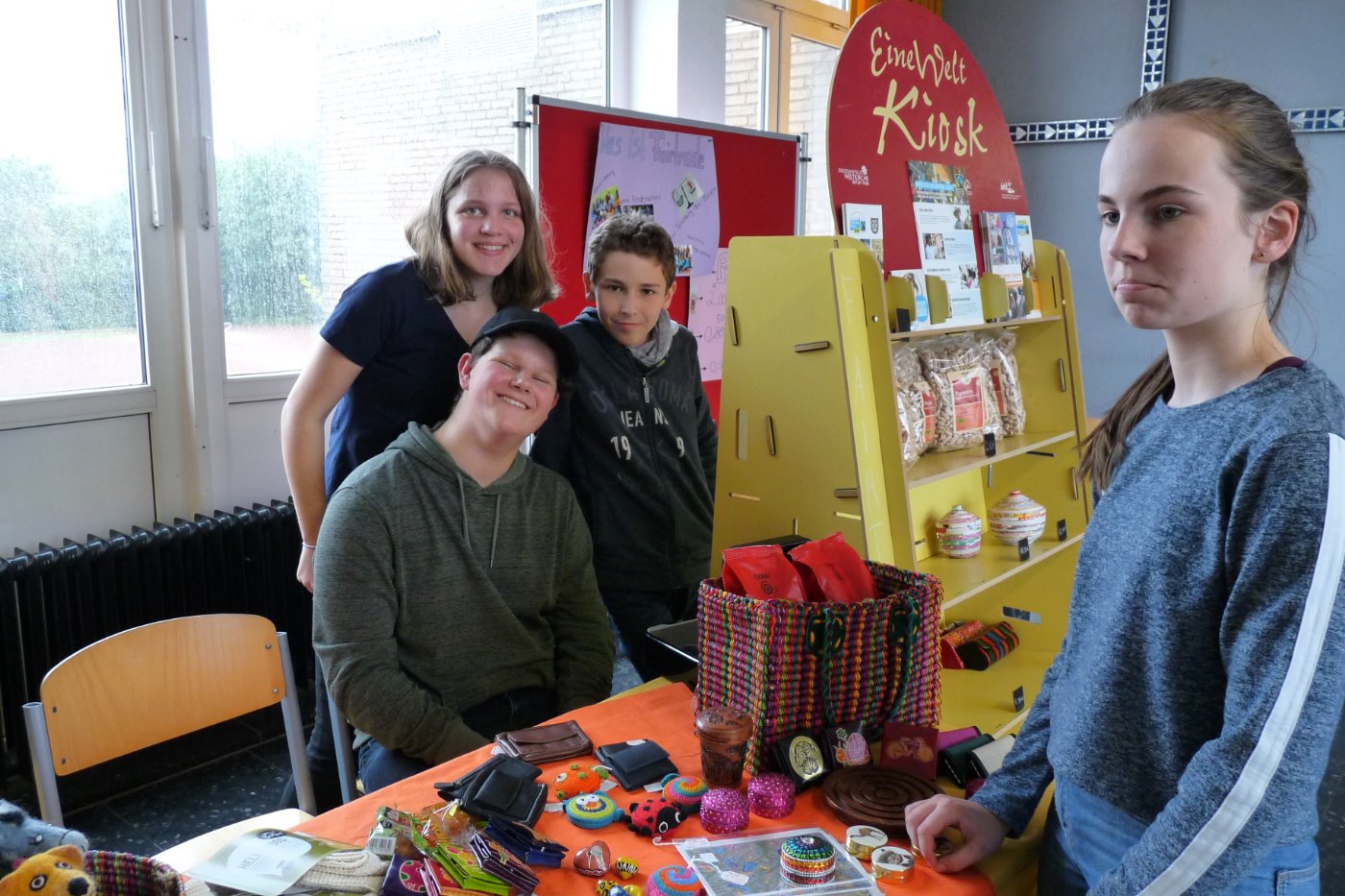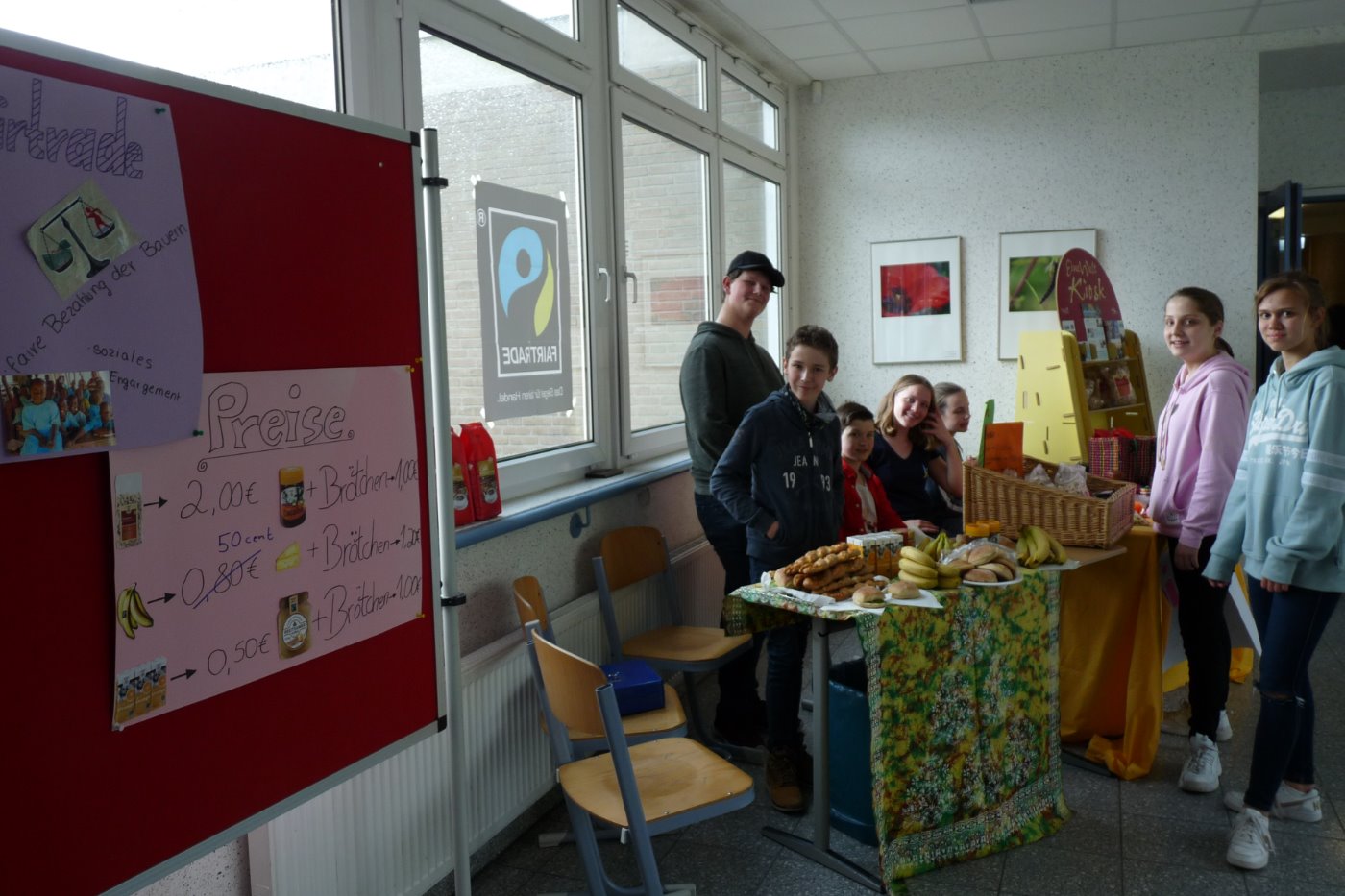 In der Pause verkaufte das Team unter anderem Brötchen mit Cocaba – eine leckere Nuss Nougat Crème mit feinen Haselnüssen, Bananen, Orangensaft und Popquins. Darüber hinaus standen auch fair gehandelte handwerkliche Produkte zum Verkauf. Das Team war mit viel Engagement bei der Sache. „Der Tag hat uns viel Spaß gemacht und kam gut an“, fasste Jana Grüters (Klasse 8e) zusammen.