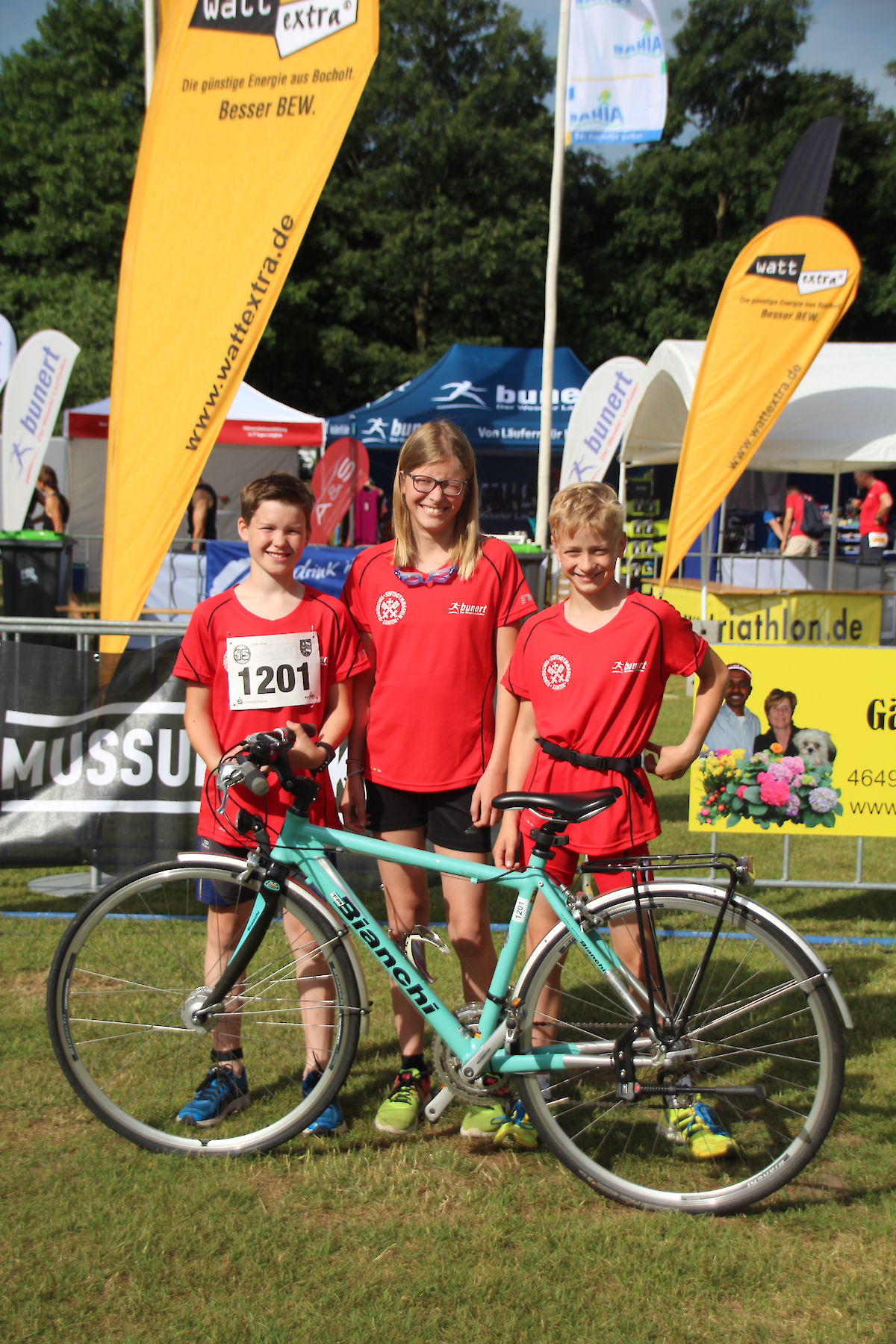 Die Triathlon-Schul-Staffel bestehend aus Lilli Noack (200m Schwimmen), Fynn Reinders (10km Radfahren) und Olé Kuse (2,5km Laufen) konnte sich am vergangenen Wochenende beim 15. Bocholter-Schülertriathlon mit einer Gesamtzeit von 0:43:48 Stunden gegen 58 andere Staffeln und mit 26 Sekunden Vorsprung gegenüber dem Zweitplatzierten durchsetzen.