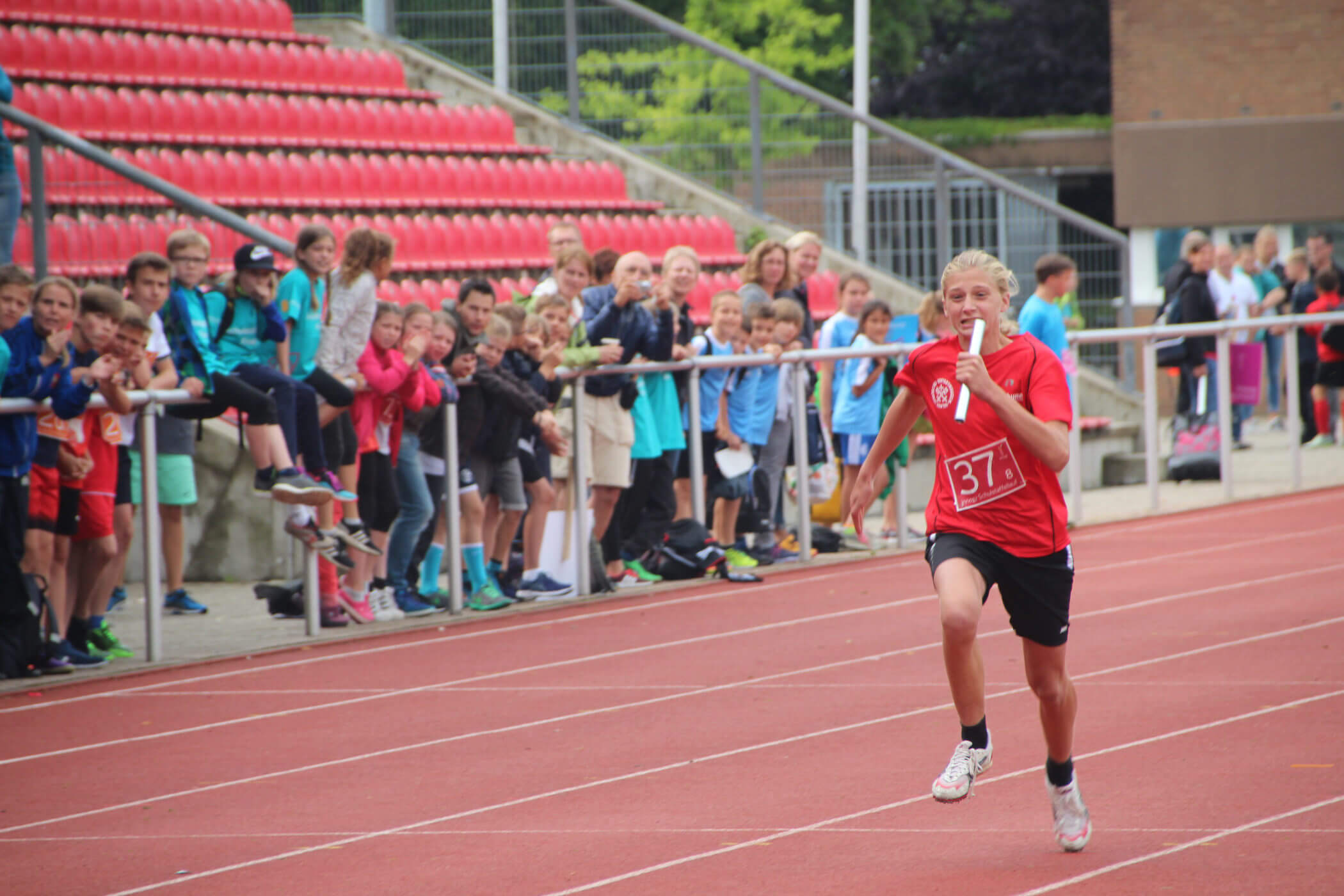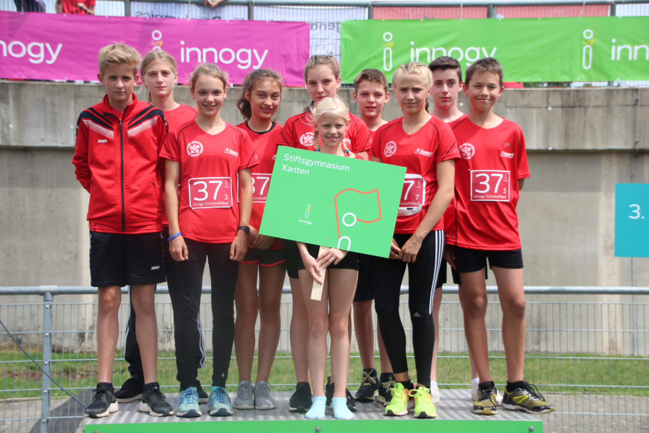 Die Schulstaffel bestehend aus Merret Manten, Zoe Rehbock, Jessica Terhorst, Alexander Thiel, Tim Herr, Johanna Keller, Anna-Lena Berninger sowie Schlussläufer Jos Landers trat am Mittwoch zum Finale des innogy-Schulstaffellaufs in Rheine an. Insgesamt waren 23 Mannschaften aus dem ganzen Bundesland eingeladen. Aufgrund der Leistung aus dem Vorlauf startete die Xantener Staffel im schnellsten Lauf, in dem sie sich starker Konkurrenz ausgesetzt sah. Nicht alle Wechsel klappten einwandfrei, dafür boten alle Läufer eine starke kämpferische Leistung. Am Ende fehlte nach einem spannenden Finish nur ein knapper Meter auf Rang 2!